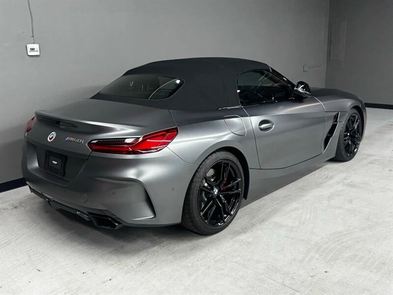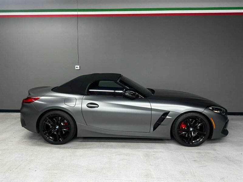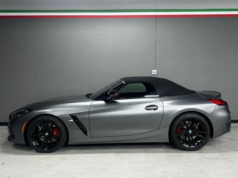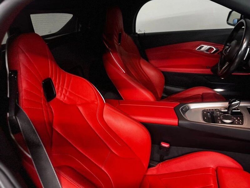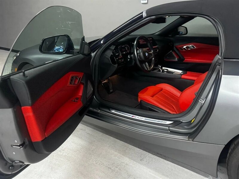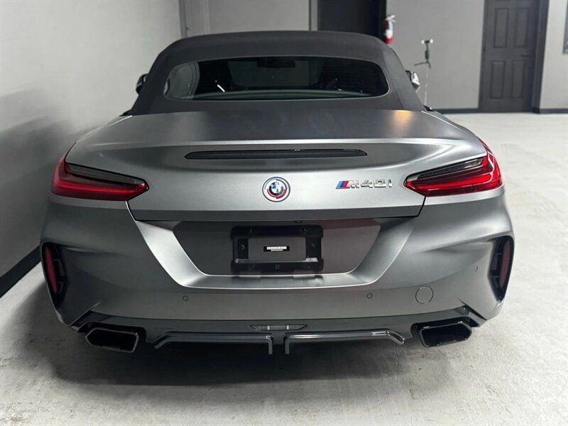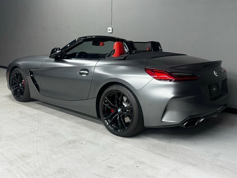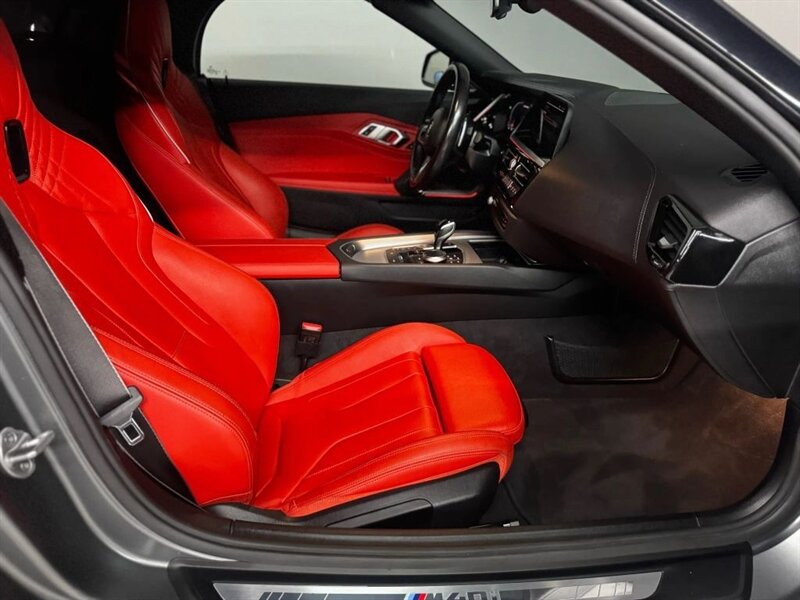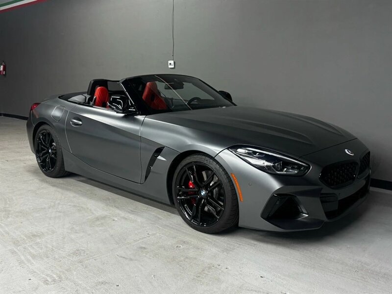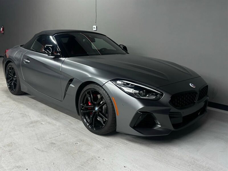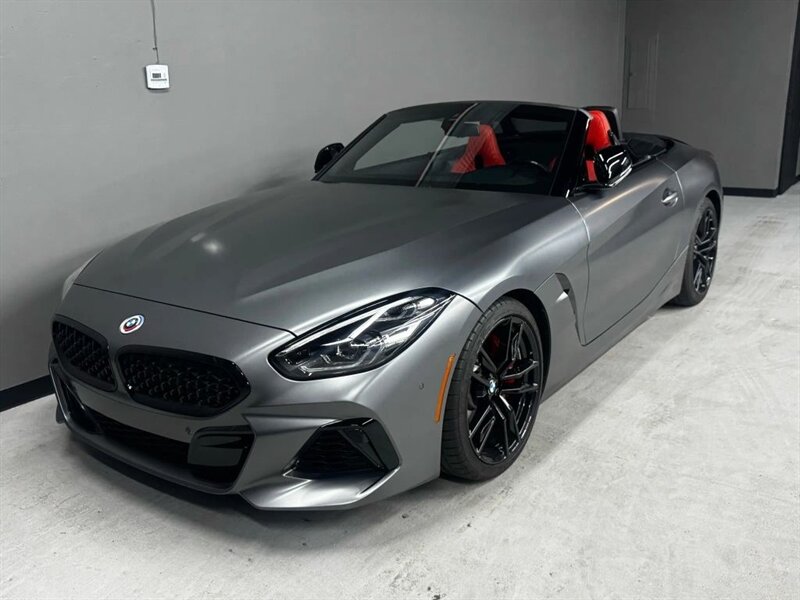 2022 BMW Z4 M40i in Frozen Grey II Metallic with Red leather interior. Powered by a 3.0L turbocharged inline-6 producing 382 hp and 369 lb-ft, with an 8-speed automatic transmission and rear-wheel drive. Factory-standard equipment includes a power folding soft-top, adaptive M suspension and sport steering, M sport seats with power adjustment and memory, dual-zone automatic climate control, BMW Live Cockpit infotainment with navigation and iDrive controller, smartphone integration (Apple CarPlay), Harman Kardon premium audio, keyless entry with push-button start, and a suite of safety and driver-assistance features including rearview camera and parking sensors. Excellent overall condition with under 22,000 miles (averaging less than 5,000 miles per year); EPA-estimated 22 MPG city / 29 MPG highway.